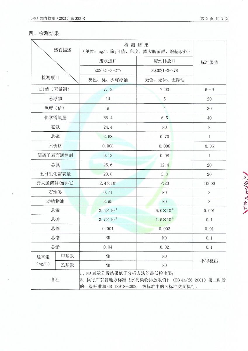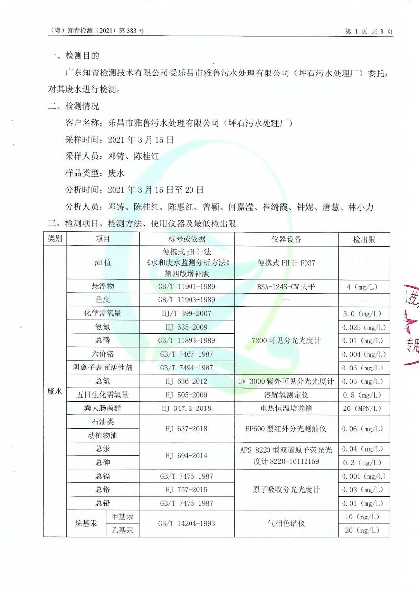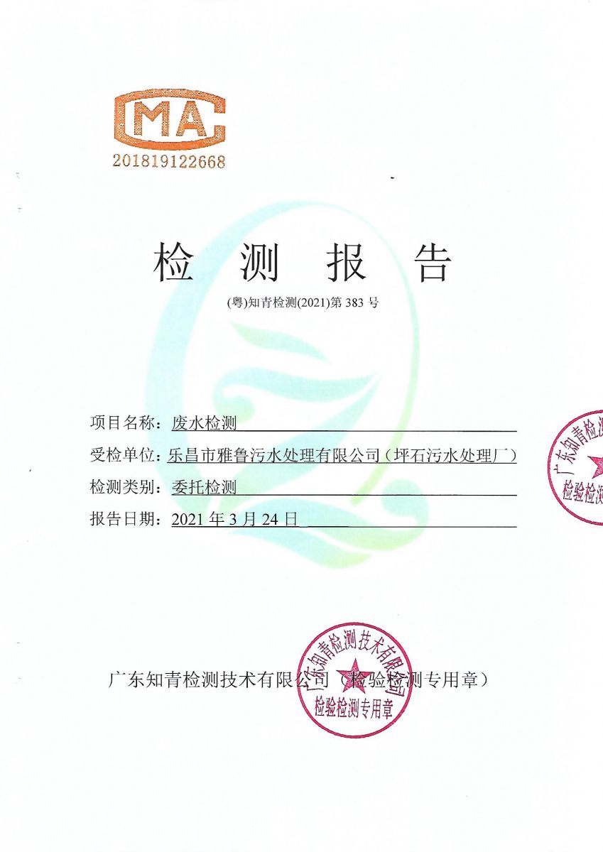 坪石污水處理廠2021年3月份檢測報告