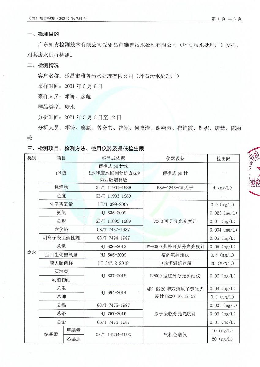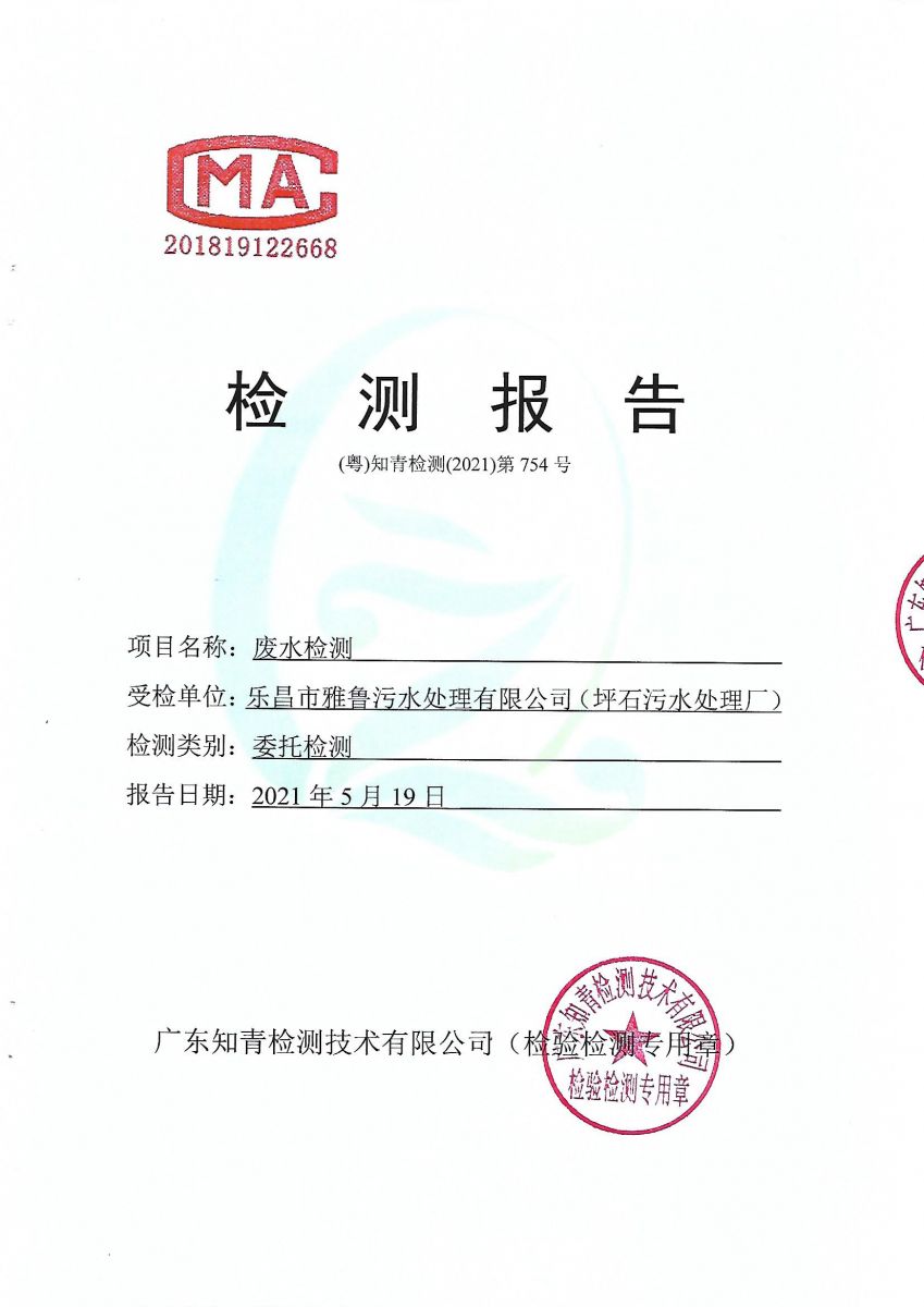 坪石污水處理廠2021年5月份檢測報告