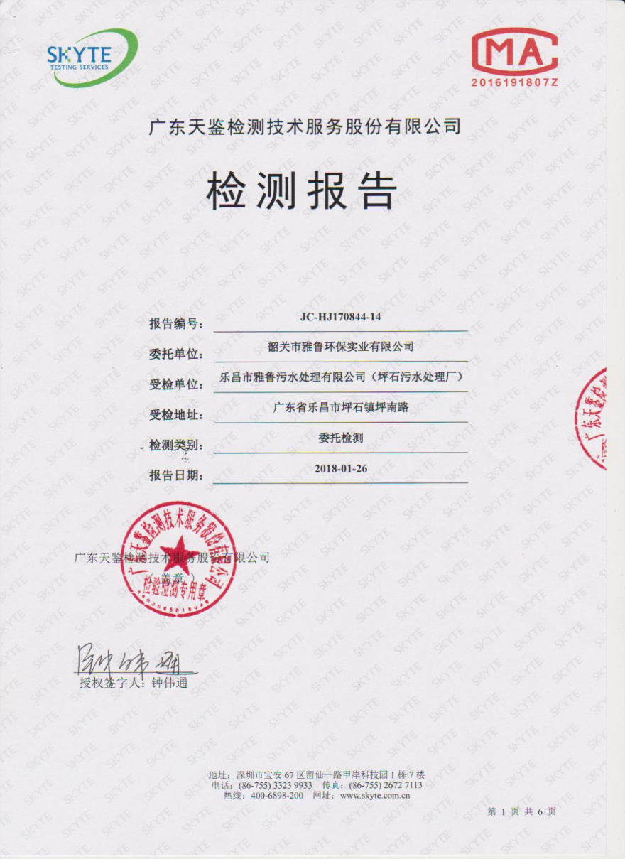 樂昌市雅魯污水處理有限公司第三方監(jiān)測報告1月