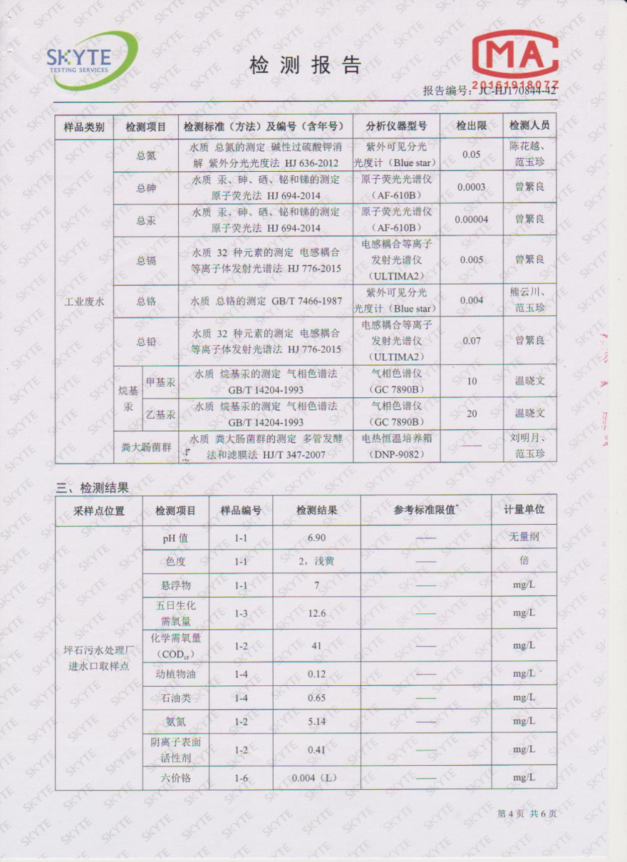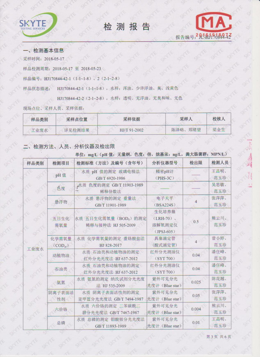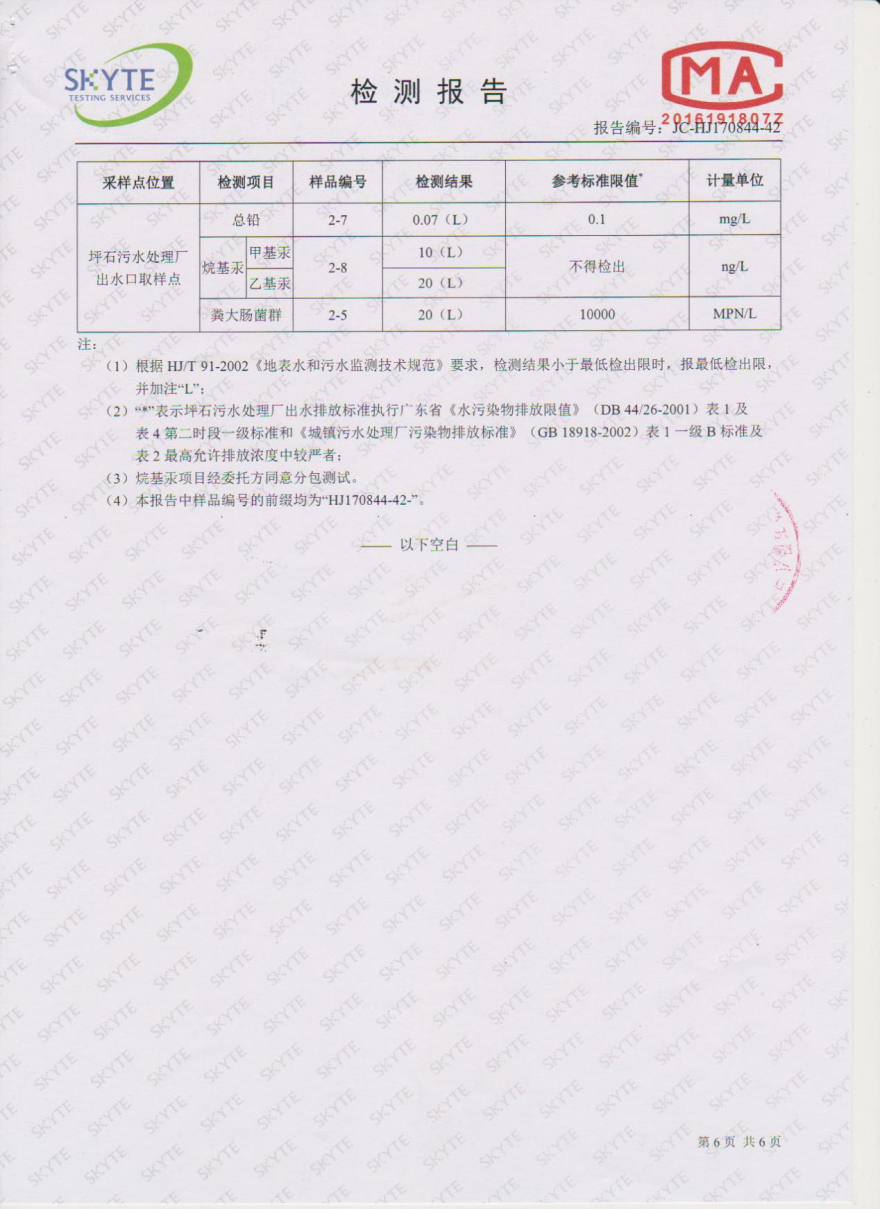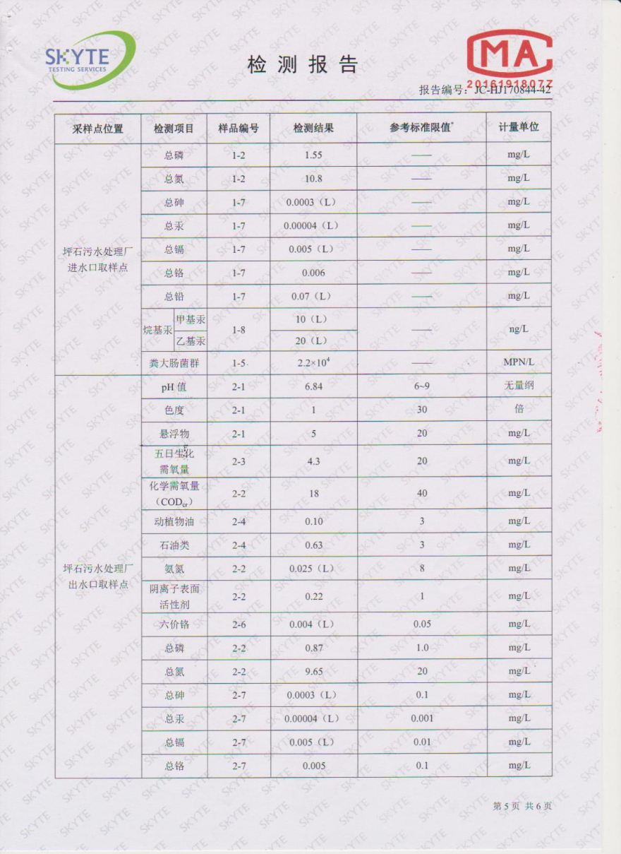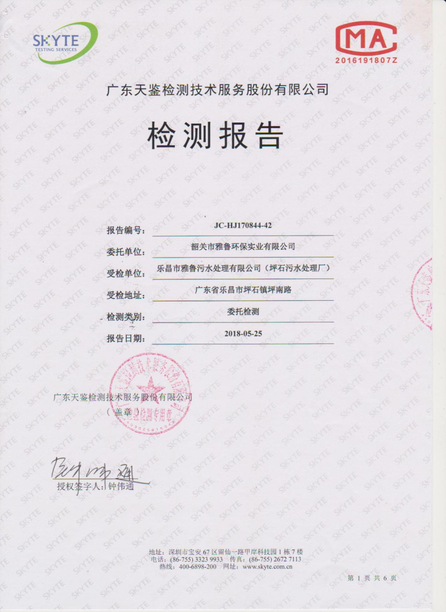 樂昌市雅魯污水處理有限公司第三方監測報告5月