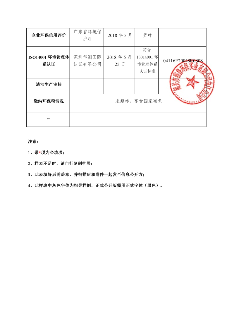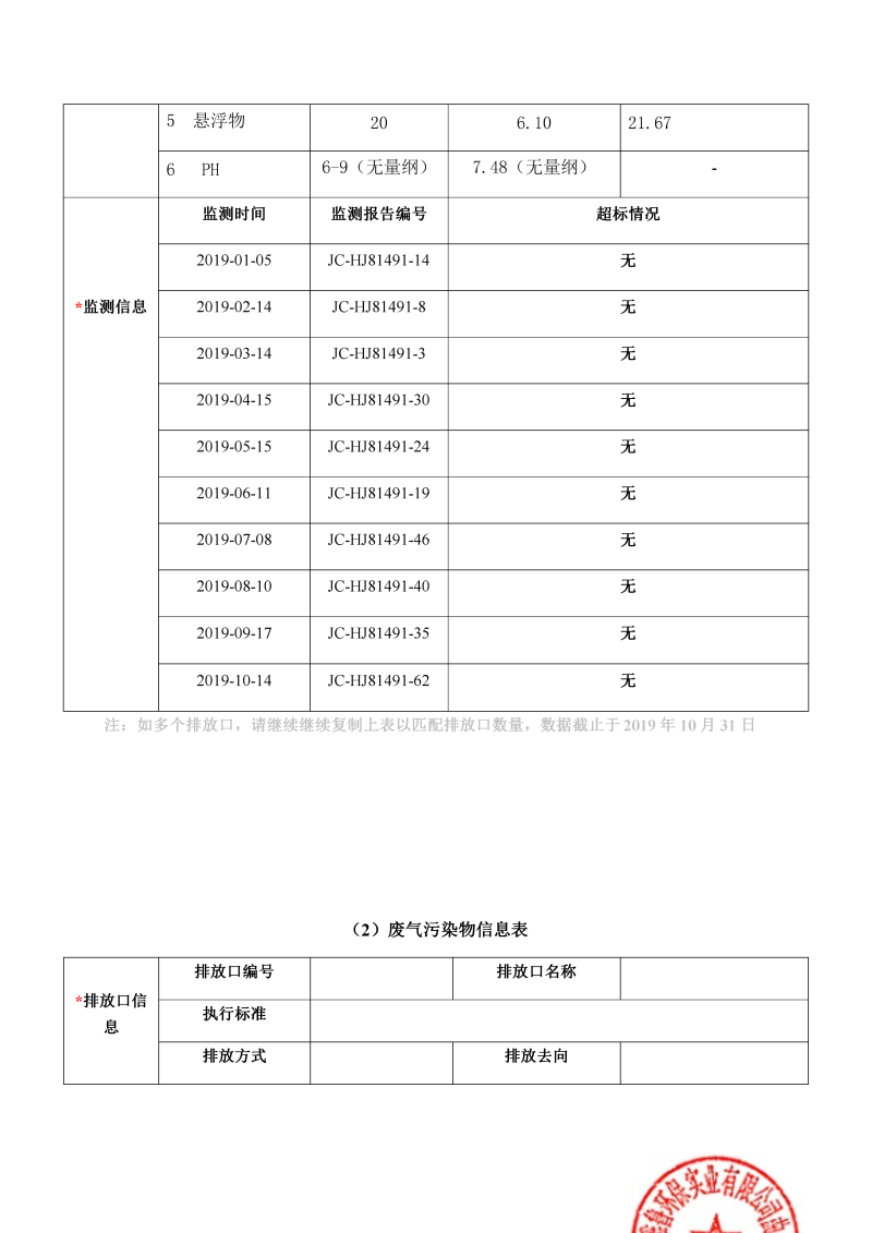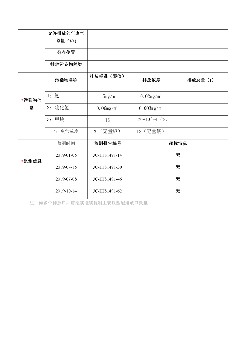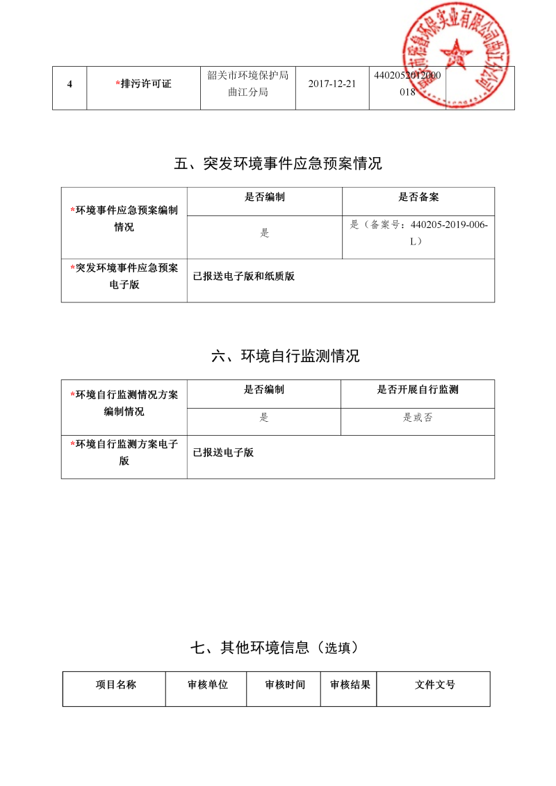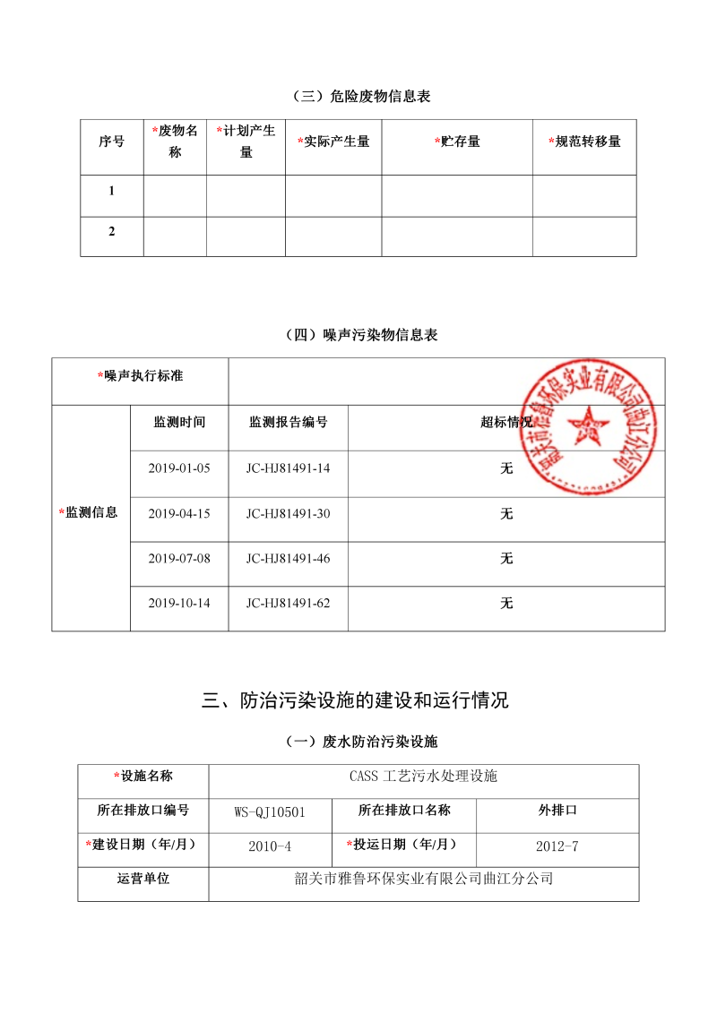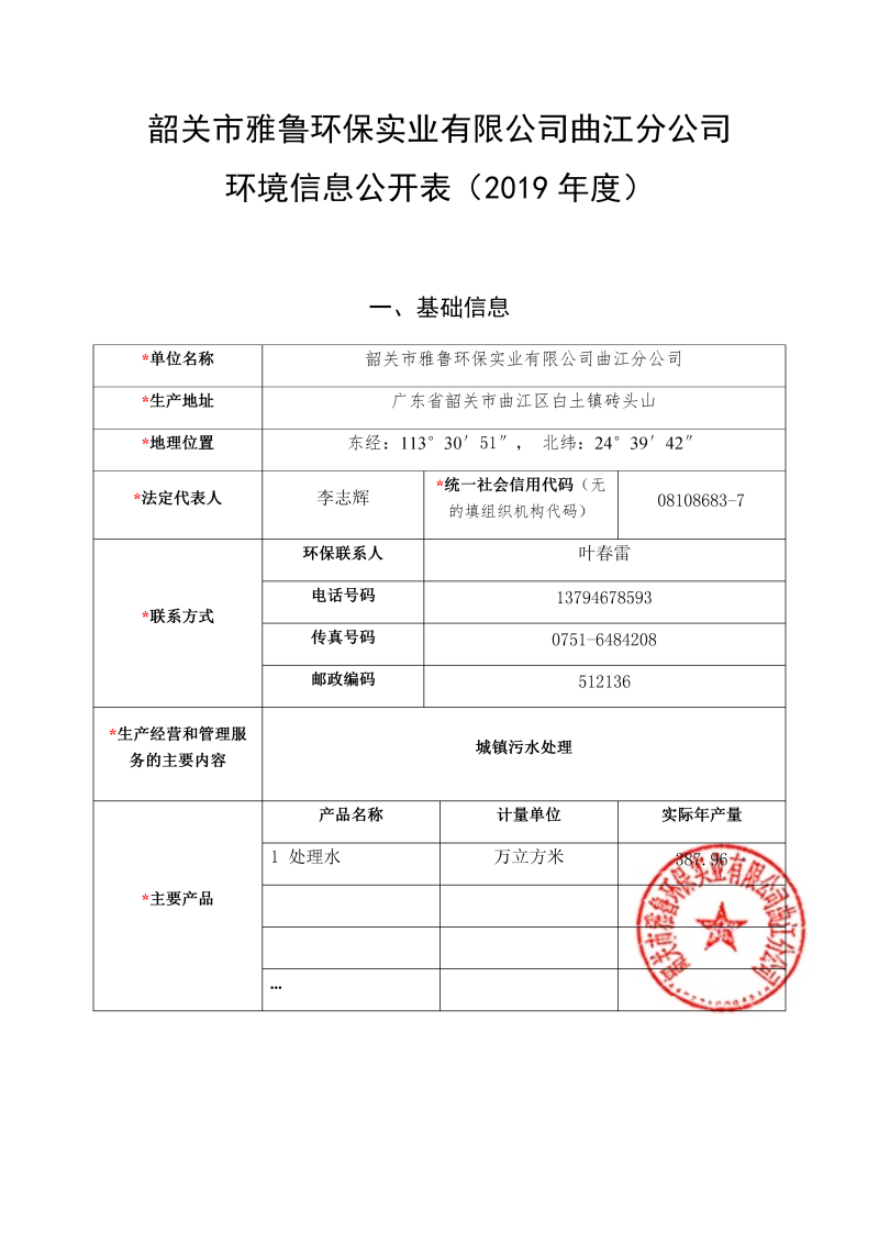 韶關市雅魯環保曲江分公司環境信息公開表(2019年度)